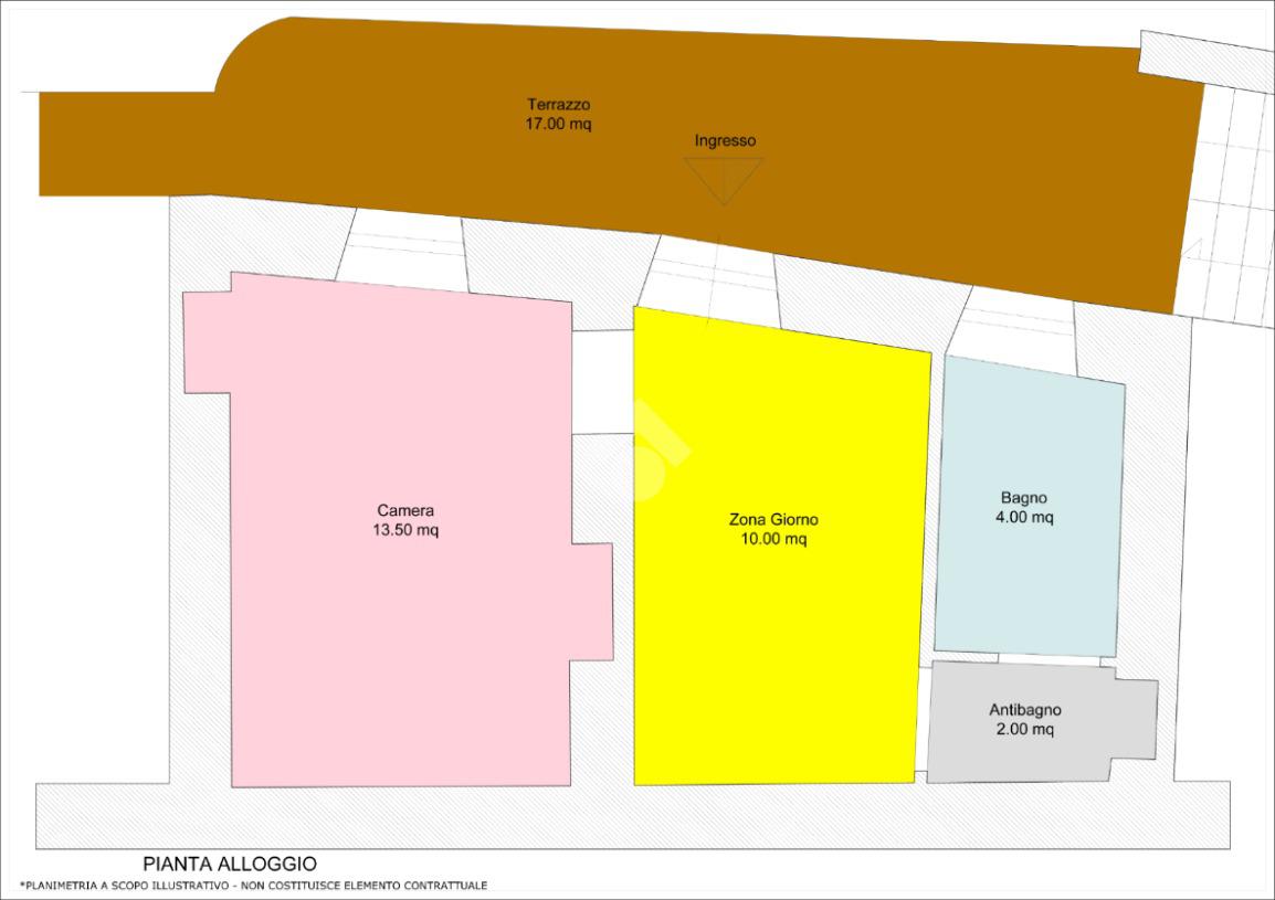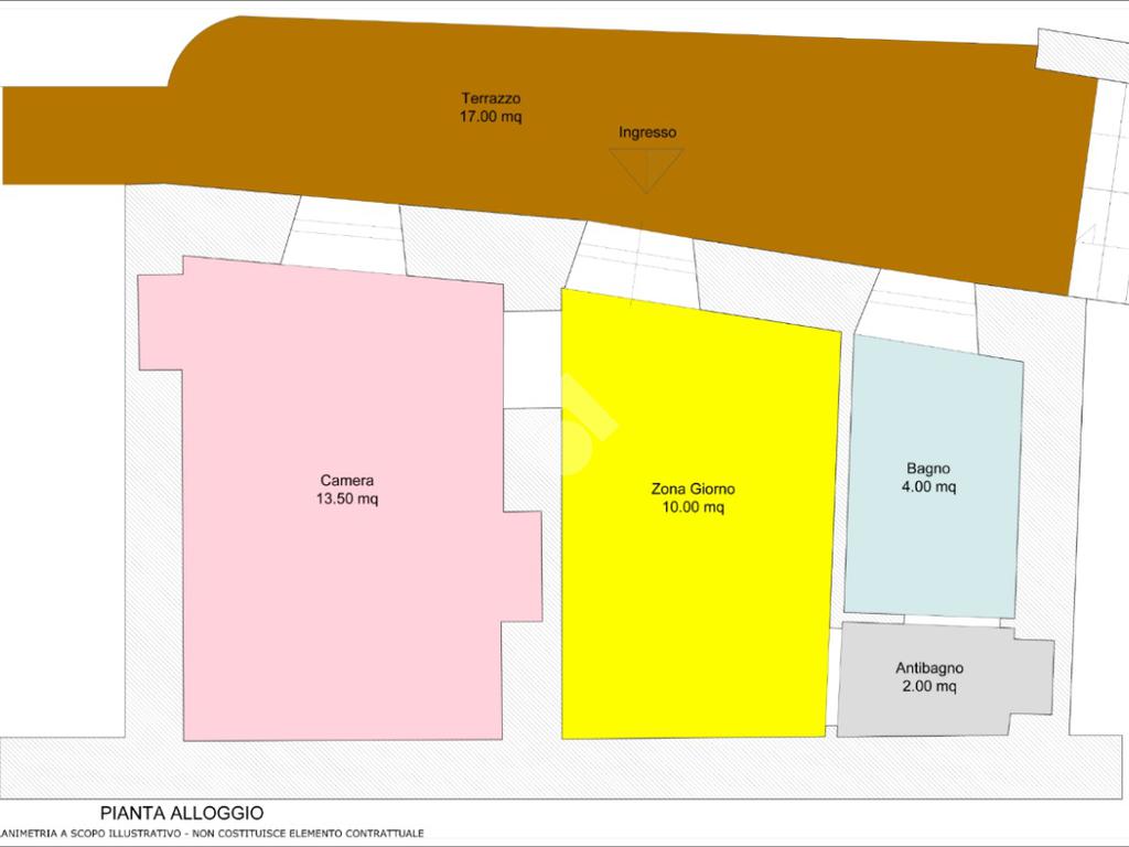 Attraverso il terrazzo antistante, posto al primo piano, si accede all’unità immobiliare composta da ingresso su zona giorno con cucina a vista, antibagno, bagno e camera da letto.