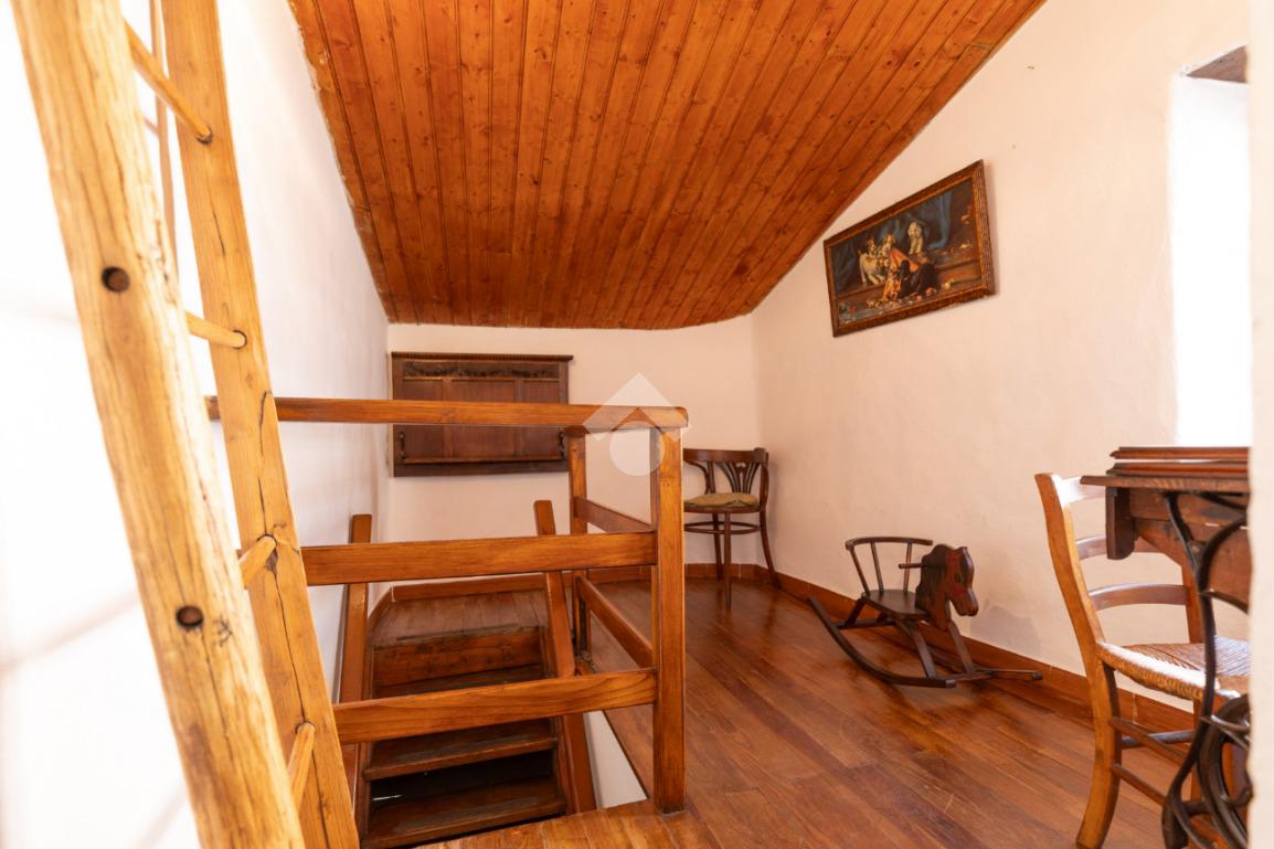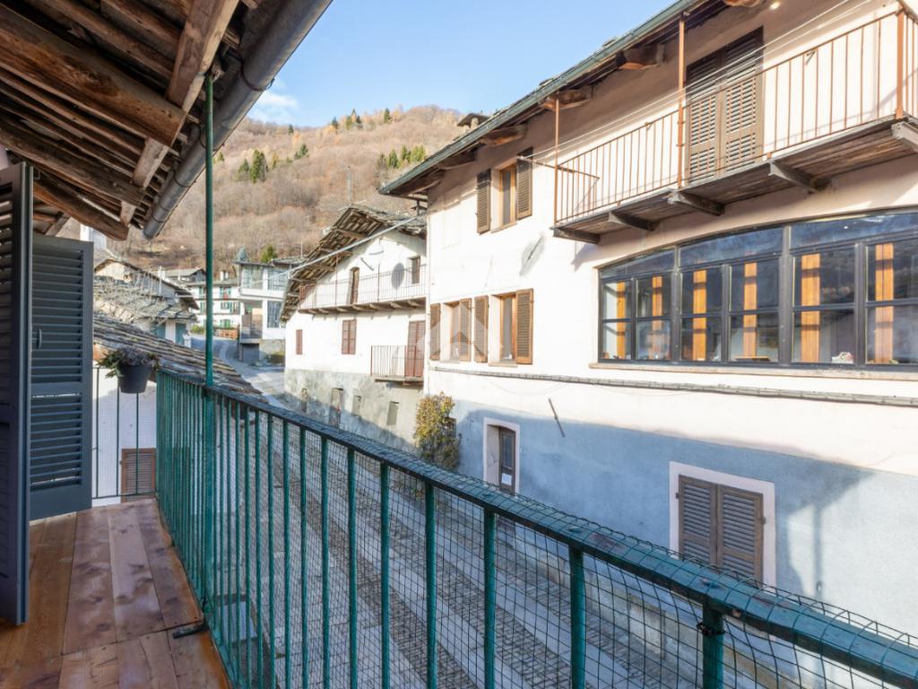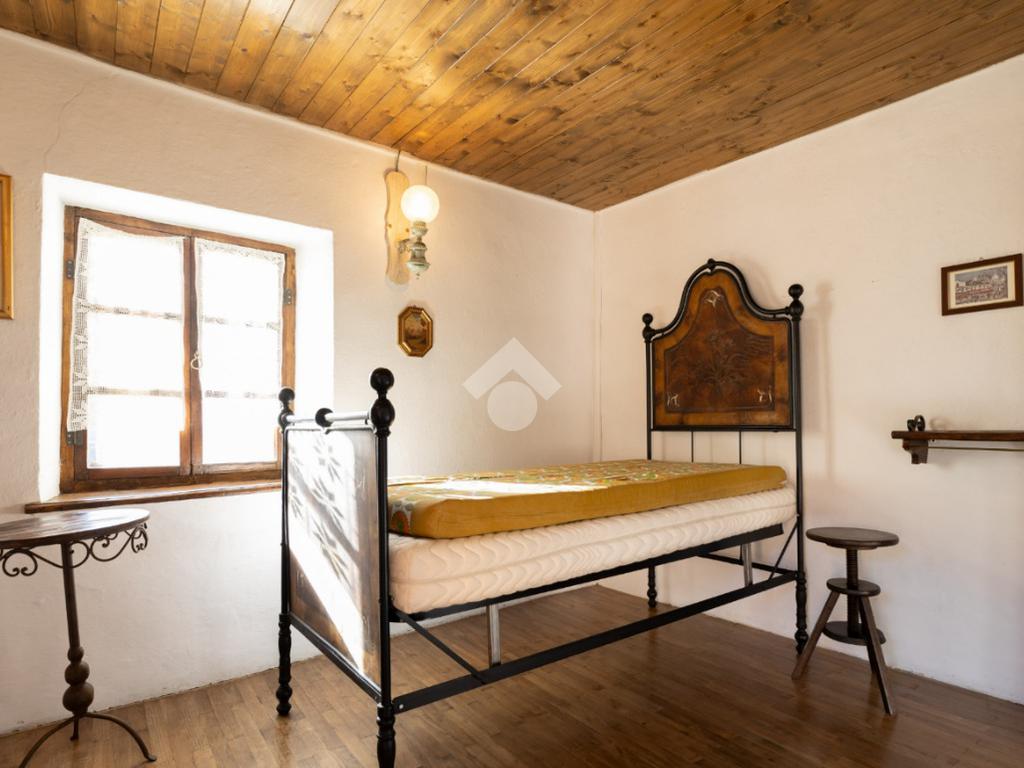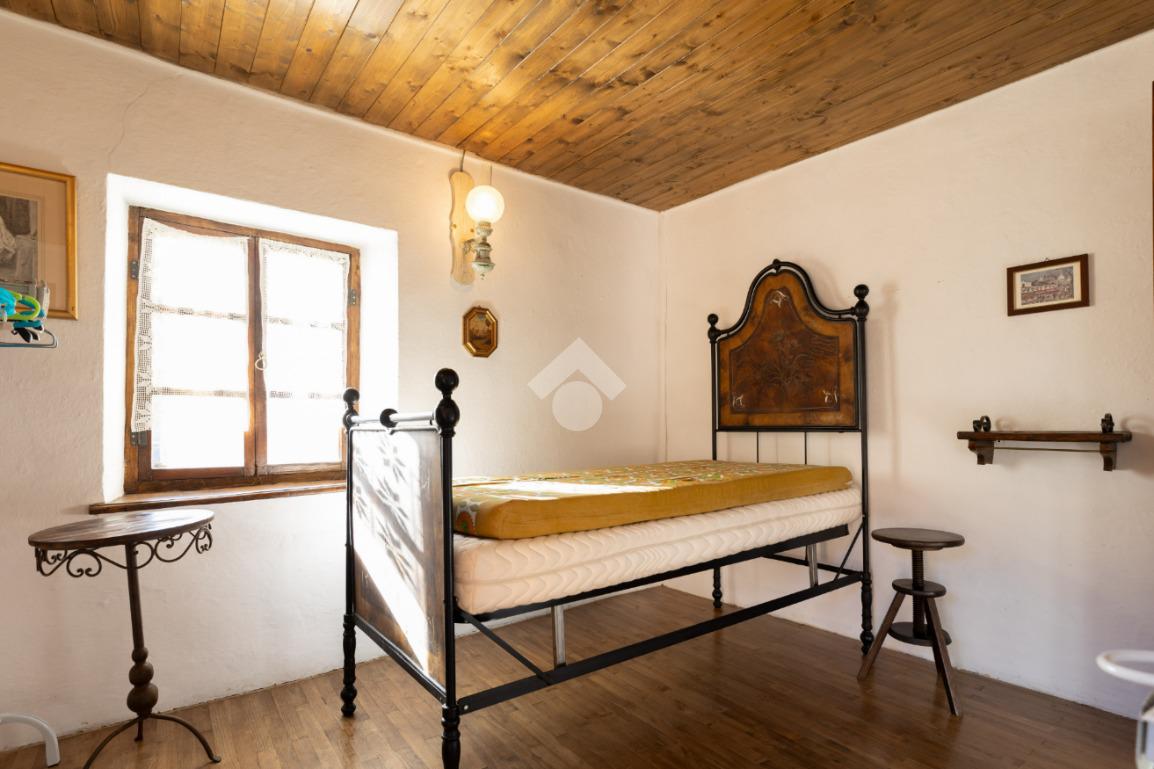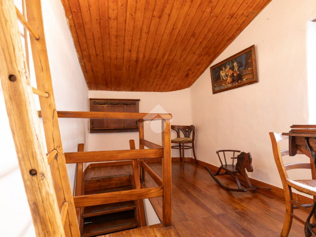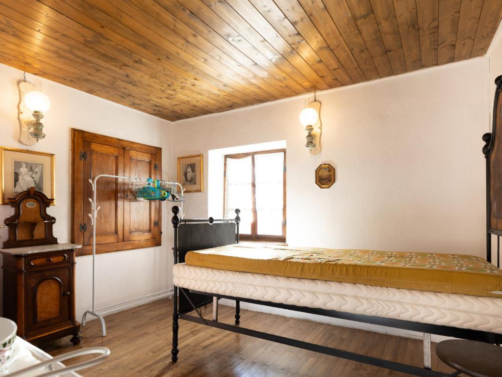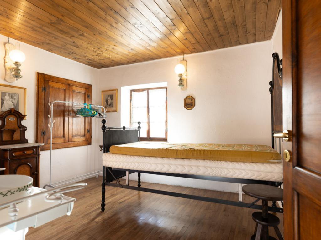 Un’originale scaletta interna in legno, elemento distintivo e caldo, conduce al piano primo. Il piano d’arrivo, sfruttabile come studiolo, angolo lettura o zona polivalente, anticipa la zona notte, composta da due camere da letto di dimensioni contenute, facili da scaldare e comunicanti tra loro, secondo la tradizione delle case di montagna. Le camere sono valorizzate da pavimentazioni in legno, soffitti rivestiti in perline, originali porte interne e serramenti anch’essi in legno, un insieme coerente che trasmette continuità, calore e un senso di autentica accoglienza. Gli ambienti affacciano sulle lunghe balconate, recentemente rifatte con assiti in legno, che accompagnano lo sguardo verso il borgo e i profili montani.