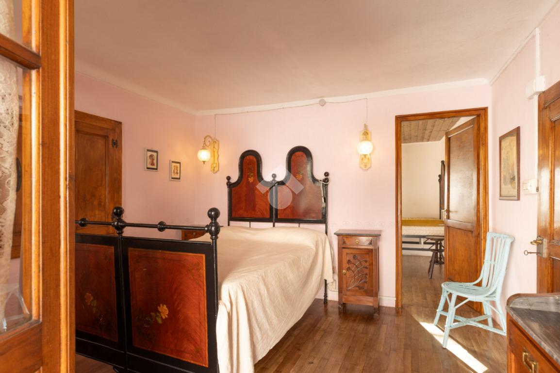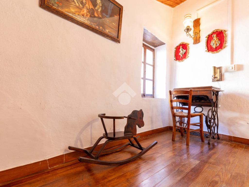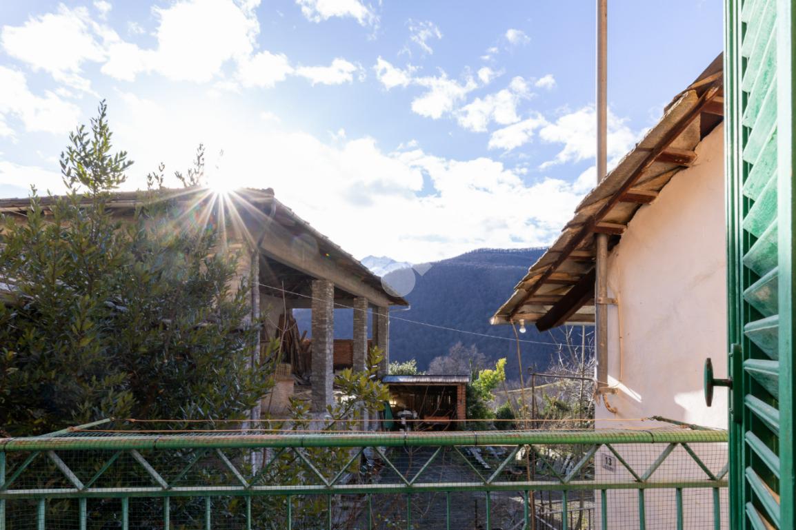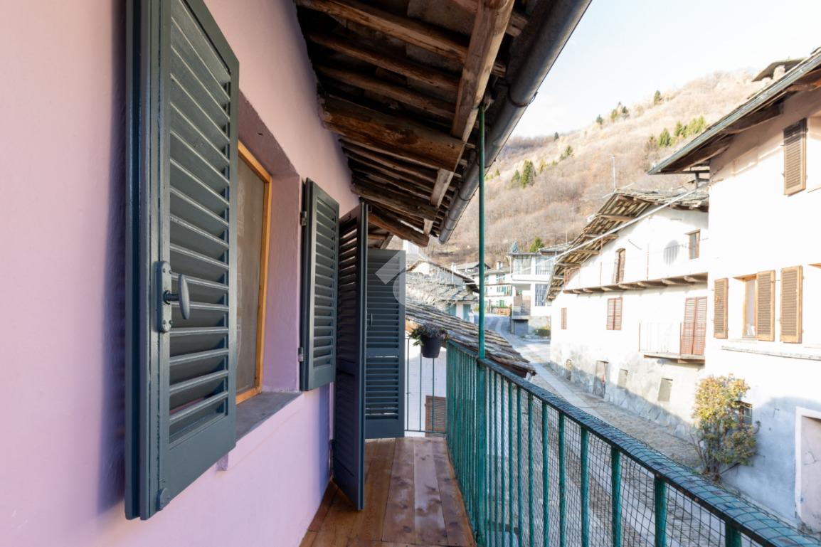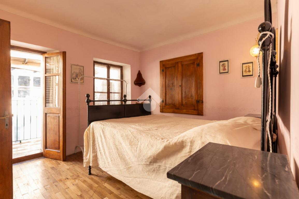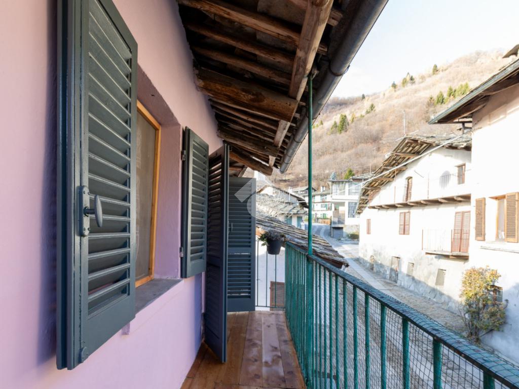 Un’originale scaletta interna in legno, elemento distintivo e caldo, conduce al piano primo. Il piano d’arrivo, sfruttabile come studiolo, angolo lettura o zona polivalente, anticipa la zona notte, composta da due camere da letto di dimensioni contenute, facili da scaldare e comunicanti tra loro, secondo la tradizione delle case di montagna. Le camere sono valorizzate da pavimentazioni in legno, soffitti rivestiti in perline, originali porte interne e serramenti anch’essi in legno, un insieme coerente che trasmette continuità, calore e un senso di autentica accoglienza. Gli ambienti affacciano sulle lunghe balconate, recentemente rifatte con assiti in legno, che accompagnano lo sguardo verso il borgo e i profili montani.