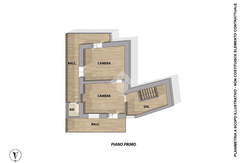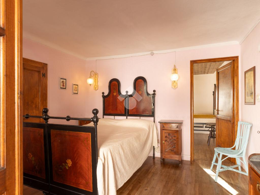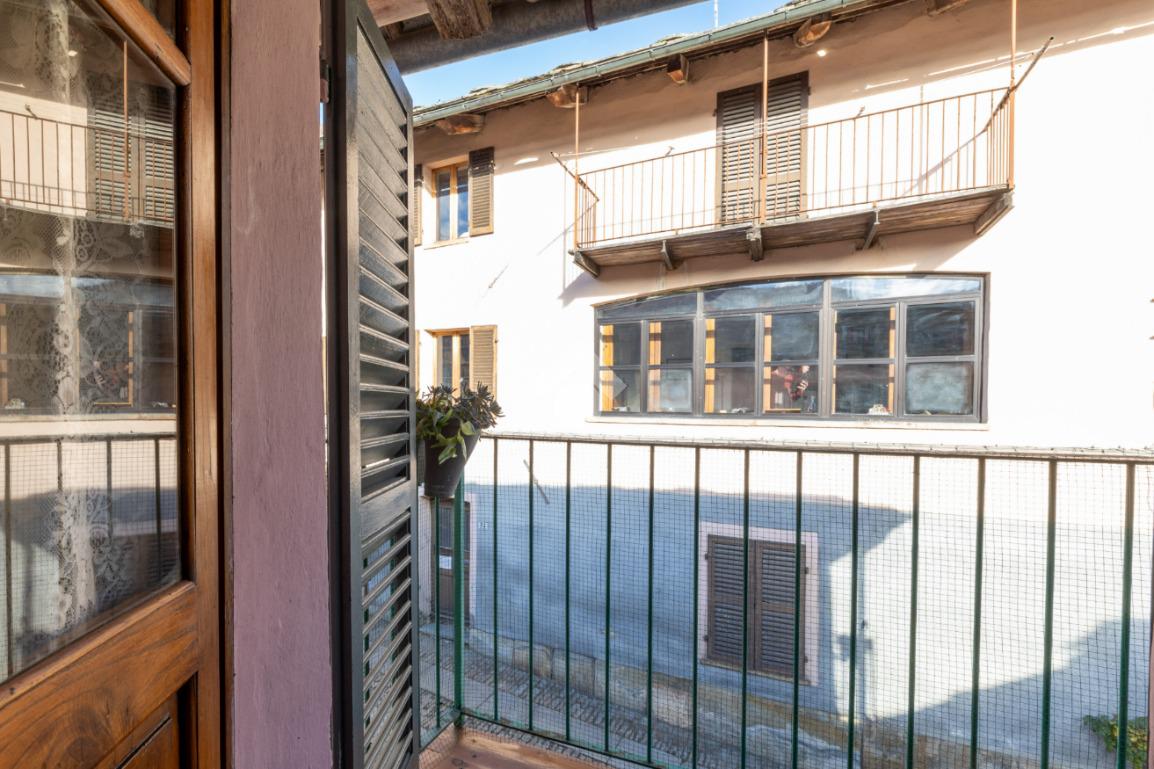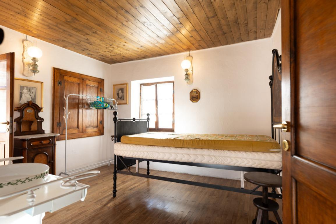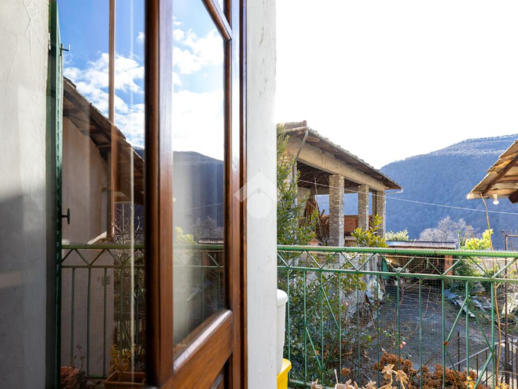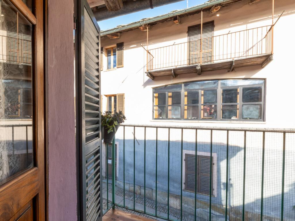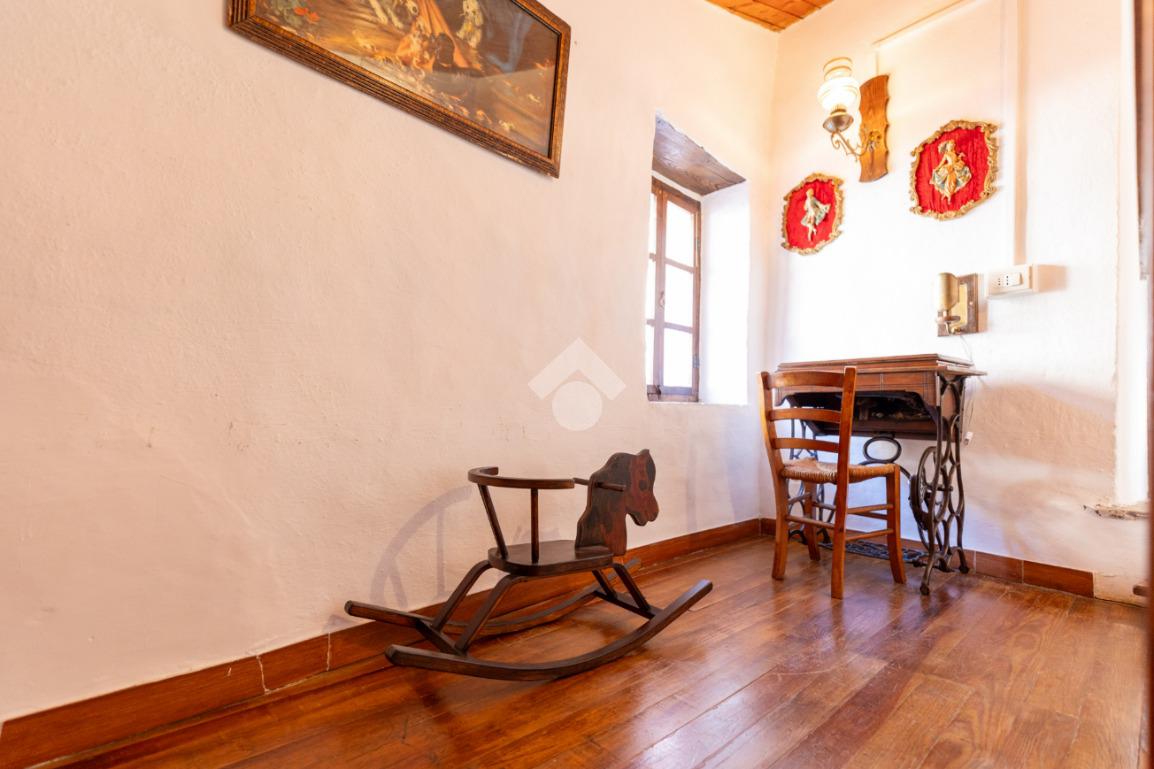 Un’originale scaletta interna in legno, elemento distintivo e caldo, conduce al piano primo. Il piano d’arrivo, sfruttabile come studiolo, angolo lettura o zona polivalente, anticipa la zona notte, composta da due camere da letto di dimensioni contenute, facili da scaldare e comunicanti tra loro, secondo la tradizione delle case di montagna. Le camere sono valorizzate da pavimentazioni in legno, soffitti rivestiti in perline, originali porte interne e serramenti anch’essi in legno, un insieme coerente che trasmette continuità, calore e un senso di autentica accoglienza. Gli ambienti affacciano sulle lunghe balconate, recentemente rifatte con assiti in legno, che accompagnano lo sguardo verso il borgo e i profili montani.